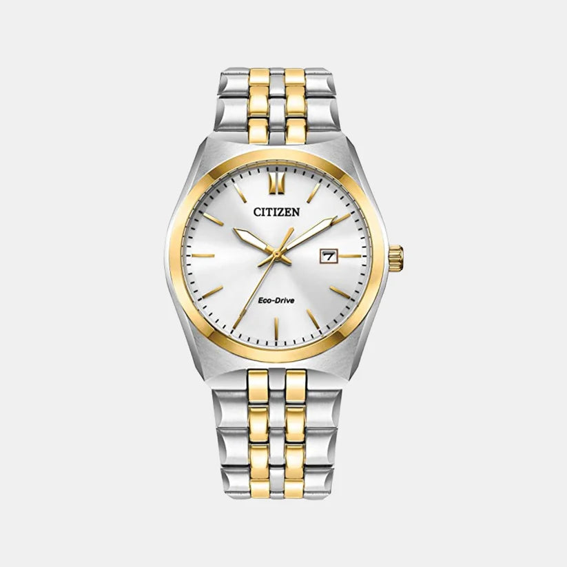 A classic timepiece is always in style in the Corso mens watch from Citizen. Featuring a two-tone gold and silver-tone stainless steel bracelet and case with a 3-hand white dial and date indicator, luminous hands and gold-tone markers, this elegant timepiece also features a fold-over clasp closure with hidden push buttons and is water resistant to 100 meters. If you are looking for a dress watch to add classic style to your wardrobe, look no further the Corso is the perfect choice. It also uses Citizens Eco-Drive technology, so it is sustainably powered by any light and will never need a battery. Caliber number E111.