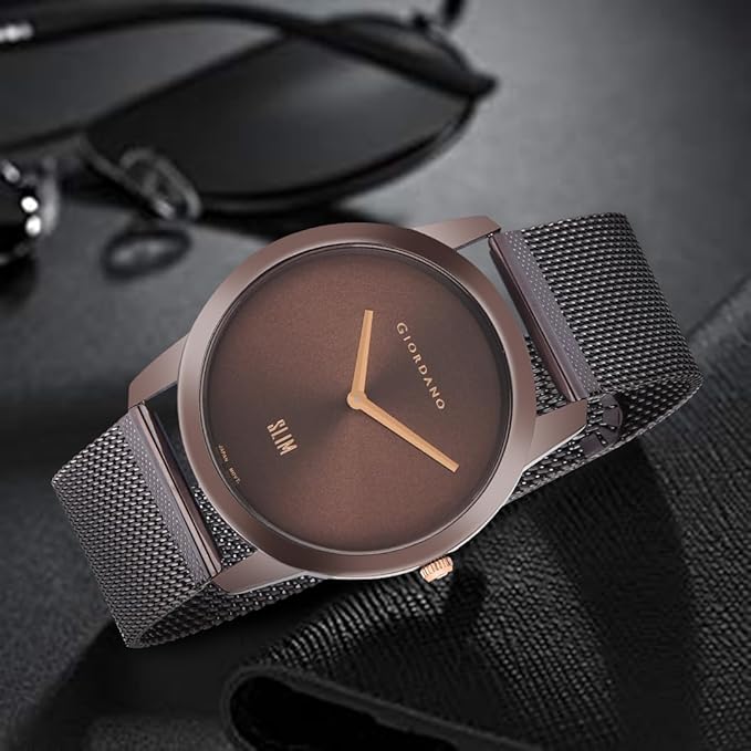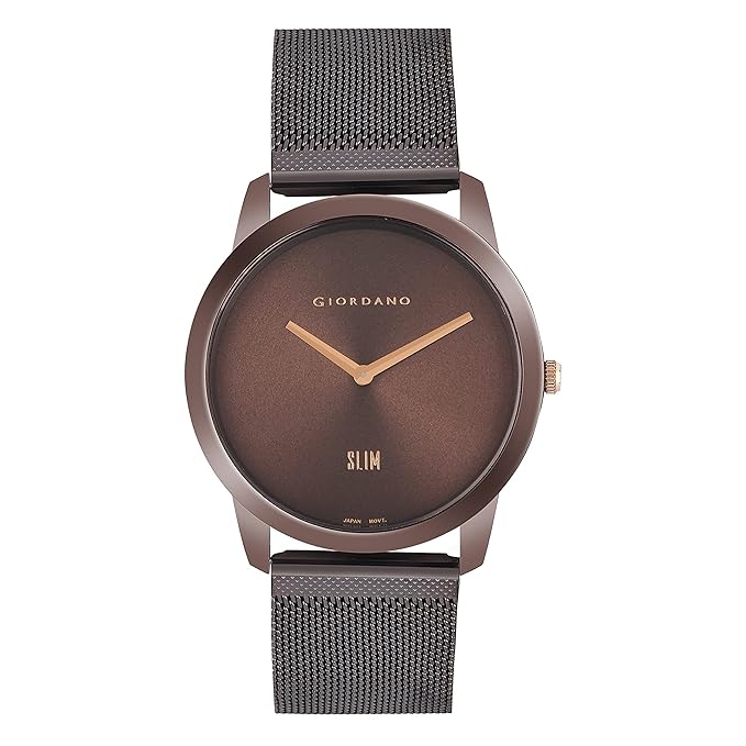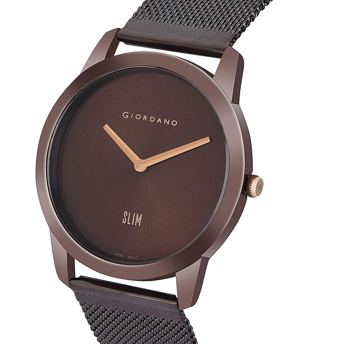 This men's analog watch from Giordano is an exquisite timepiece that has a classic style with a contemporary touch. Functional on a quartz movement, the brown round dial is housed in a 41 mm case. It displays plain two hands functionality and a crown for time adjustment. The metal strap flaunts a brown hue that accentuates the look of the watch. Besides, it is completed with a hook buckle clasp to ensure a secure fit on the wrist. This water-resistant watch will be a timeless possession.