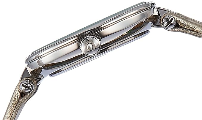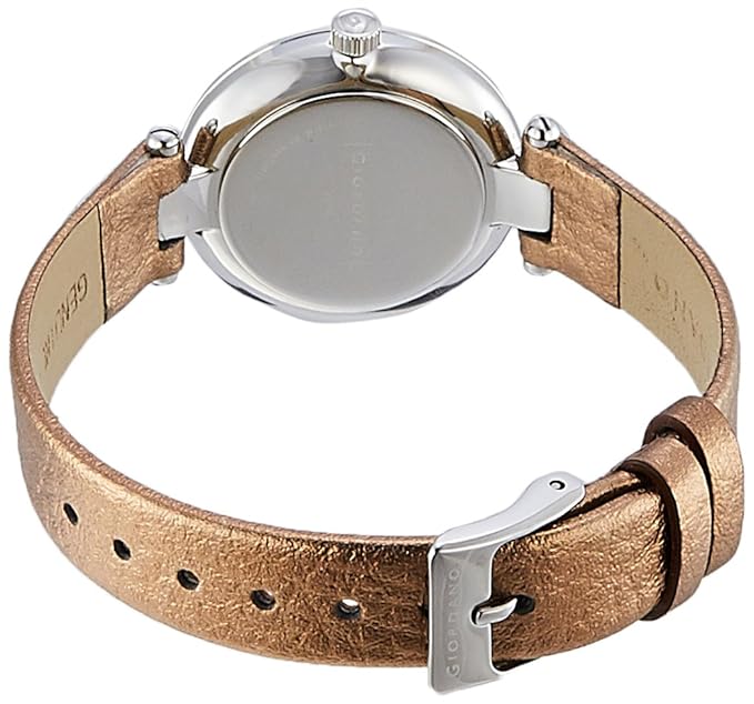 Give a modish look to your wrist by donning this women's analog watch from Giordano. Its rose gold round dial is operational on a quartz movement. It exhibits plain two hands, long stick hour markings at five-minute intervals, numeral markings at quarter intervals and a crown for time adjustment. The genuine leather strap exudes a golden hue that accentuates the look of the watch.