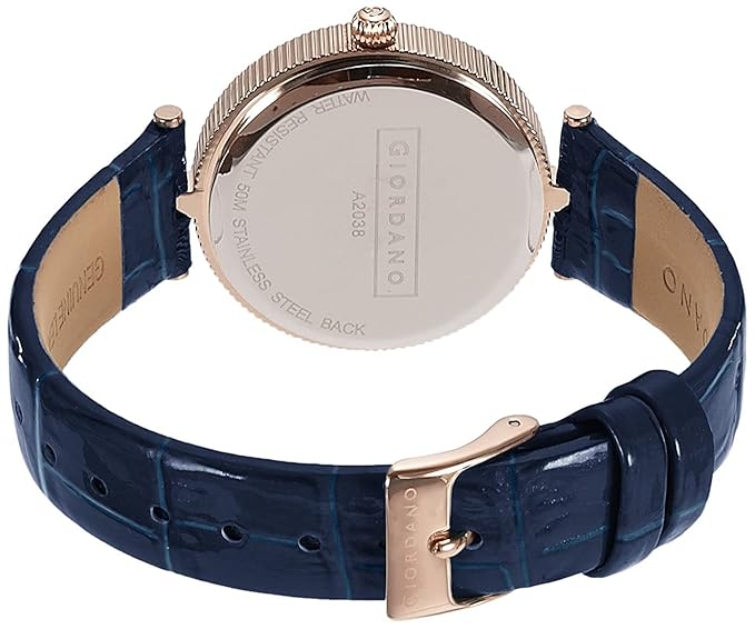 A perfect fusion of style and functionality, this women's analog watch from Giordano is sure to make a style statement. The silver round dial is housed in an elegant case. It exhibits plain three hands and a crown for time adjustment. The genuine leather strap exudes a blue hue that accentuates the look of the watch. Moreover, it is fitted with a buckle clasp to ensure a secure fit on the wrist.