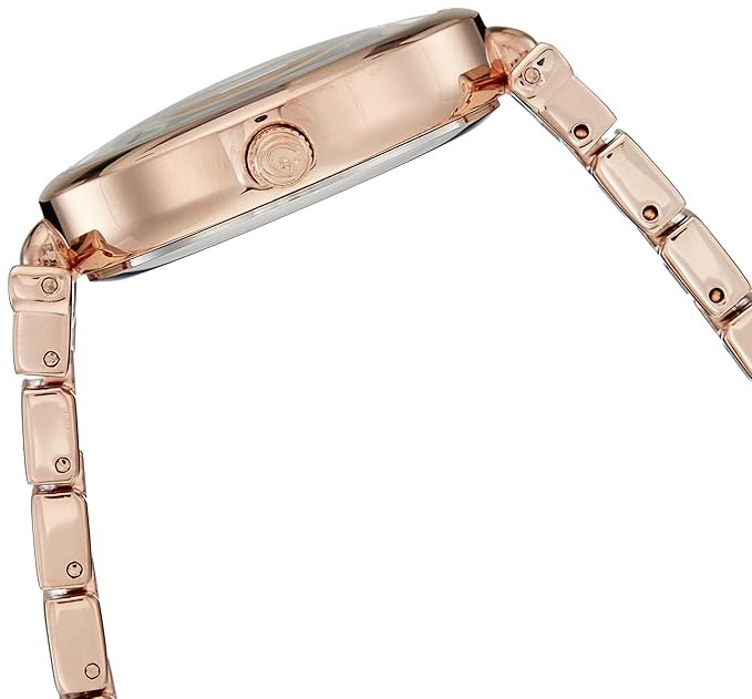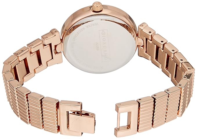 Ideal for stylish women, this analog watch from Giordano is sure to impress you. Its metal strap showcases a rose gold hue that uplifts the look of the watch. Functional on a quartz movement, the navy round dial displays plain three hands, stone studded markings at the 3rd, 6th and 9th-hour position, brand name initial at the 12th-hour position and a crown for time adjustment. Besides, it is completed with a jewellery clasp to ensure a secure fit on the wrist.