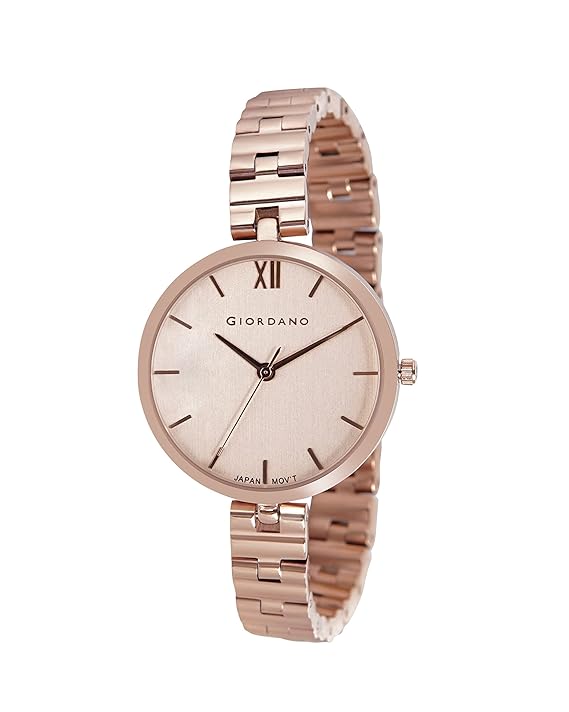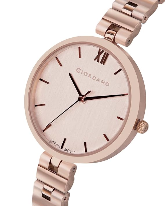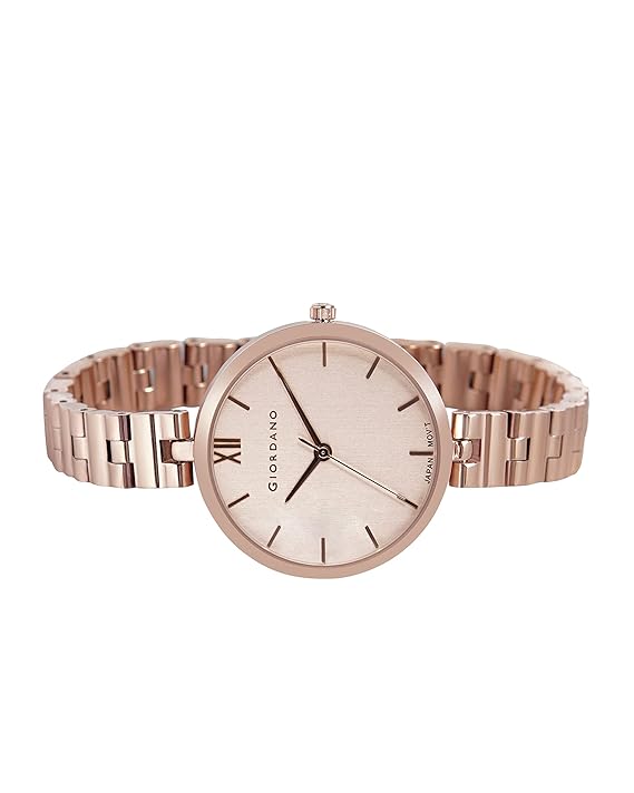 Bring a little light into your life with this women's analog watch from Giordano. The rose gold round-shaped dial features plain 3-hand functionality for time adjustment. The watch works on a quartz movement. The brass bracelet comes in a rose gold hue that further elevates the look of the watch. Besides, it is water resistant up to 30 m and is completed with a jewellery clasp to ensure a secure fit on the wrist.