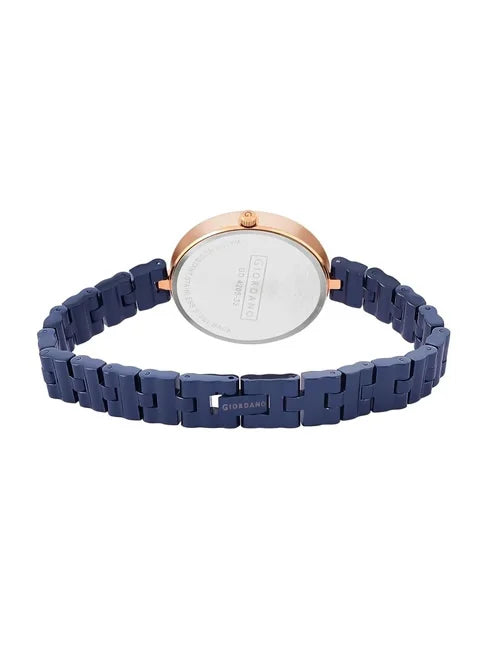 Create a genteel statement with the look and feel of this women's analog watch from Giordano. The rose gold round-shaped dial features plain 3-hand functionality for time adjustment. The watch works on a quartz movement. The brass bracelet comes in a blue hue that further elevates the look of the watch. Besides, it is water resistant up to 30 m and is completed with a jewellery clasp to ensure a secure fit on the wrist.