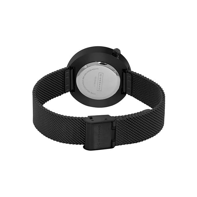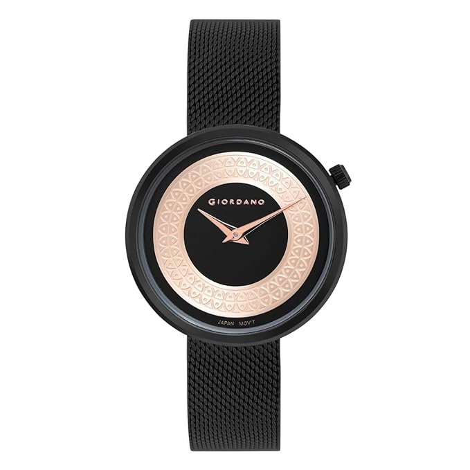 this women's analog watch from Giordano is an exquisite timepiece that has a classic style with a contemporary touch. Functional on a quartz movement, the black and rose gold round dial is housed. It displays plain two hands functionality. The metal strap flaunts a black hue that accentuates the look of the watch. Besides, it is completed with a deployement clasp to ensure a secure fit on the wrist. This water-resistant watch will be a timeless possession.
