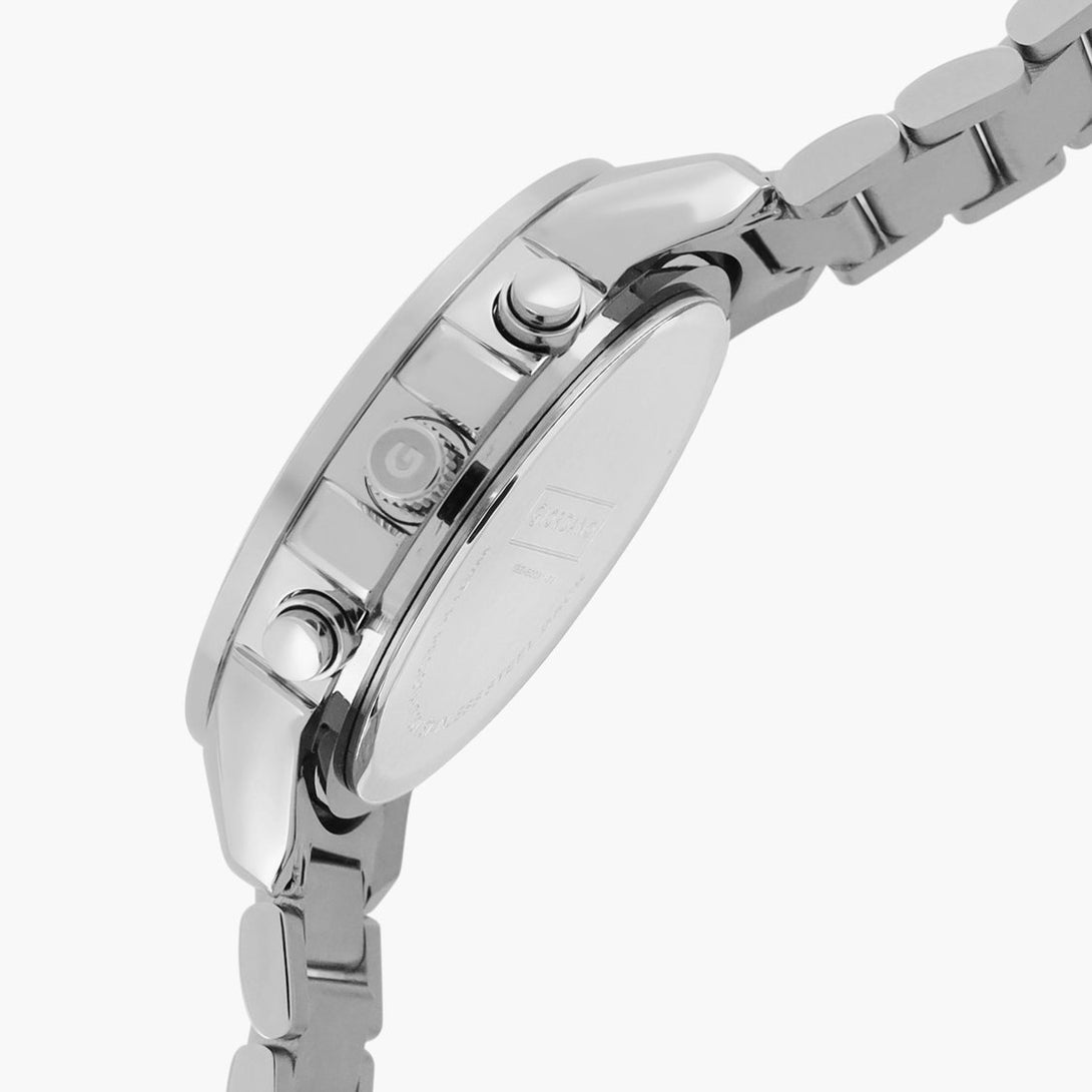 Make your presence count with this watch. It has a round dial with geometric and Arabic numeral hour markers, 3 chronograph sub-dials, and a date window between 4 and 5 o’clock. The stainless steel strap is complemented with a butterfly clasp. This watch comes with 50m water resistance.