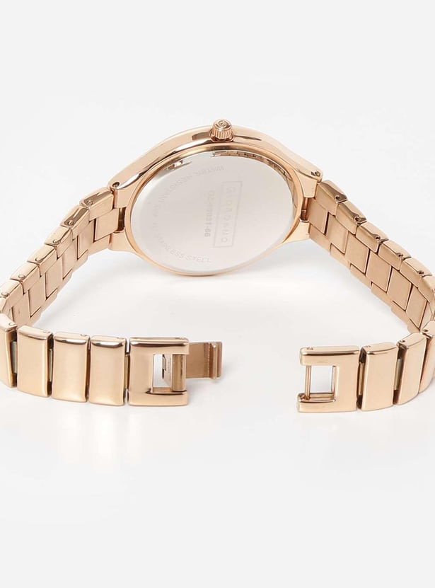 Take your outfit to the next level with this analog watch. It flaunts a textured strap and an embellished dial, making it a perfect pick for any occasion. It comes with a 30m water resistance and jewelry clasp closure.