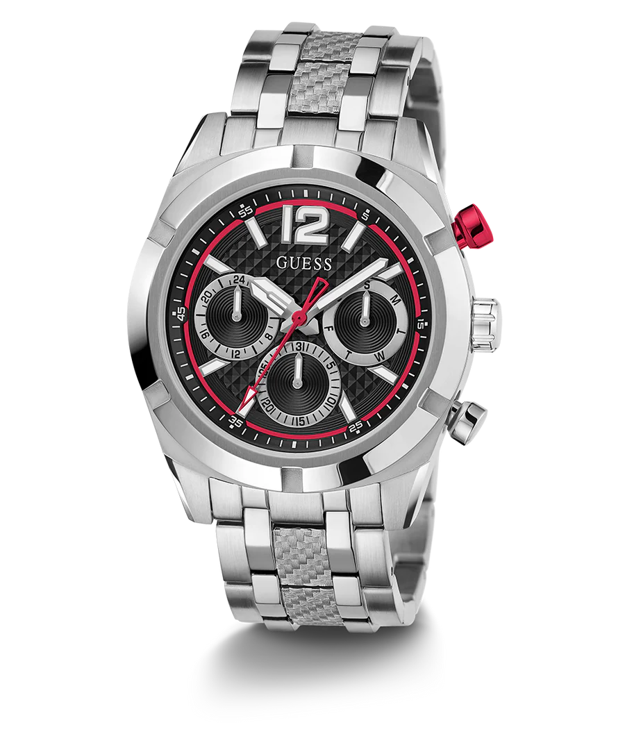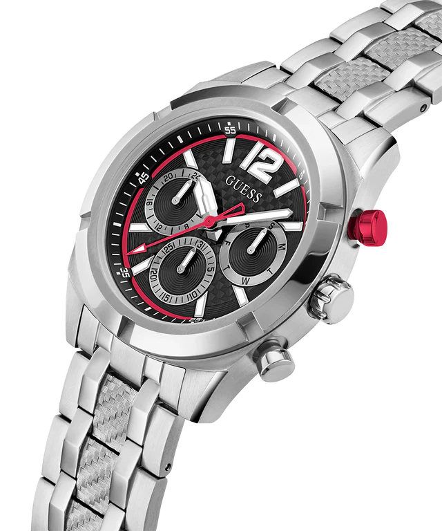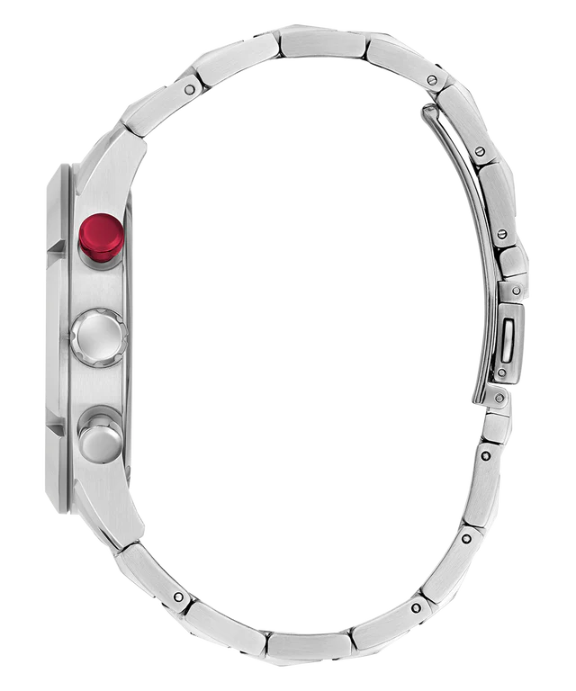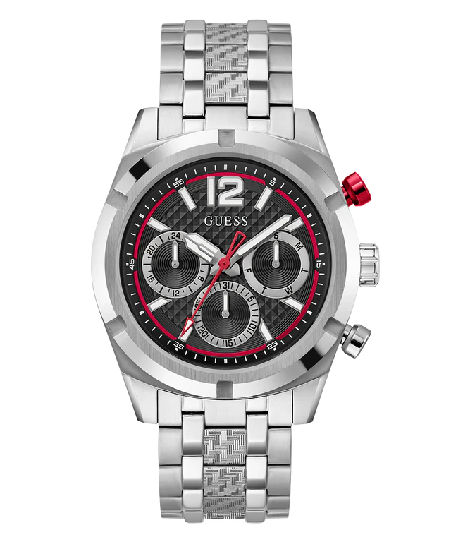 A bold Guess men's watch designed for those who value both elegance and reliability. The durable materials and precision quartz movement ensure reliable timekeeping, while the rugged design makes it suitable for both business and casual wear. Built for longevity, this watch offers both style and functionality in one versatile package for everyday use.