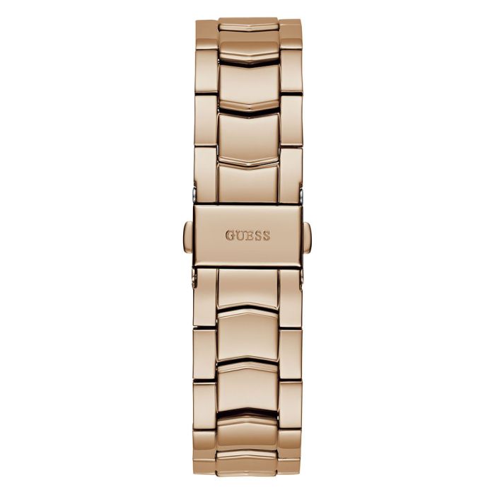 Look modish by donning thiswomen's analog watch from the collection by GUESS. Therose gold round dial is protected by a mineral glass. It features and a crown for time adjustment. The stainless steel strap comes in a rose gold hue that further elevates the look of the timekeeper. Besides, it is completed with a pilot buckle clasp to ensure a secure fit on the wrist.