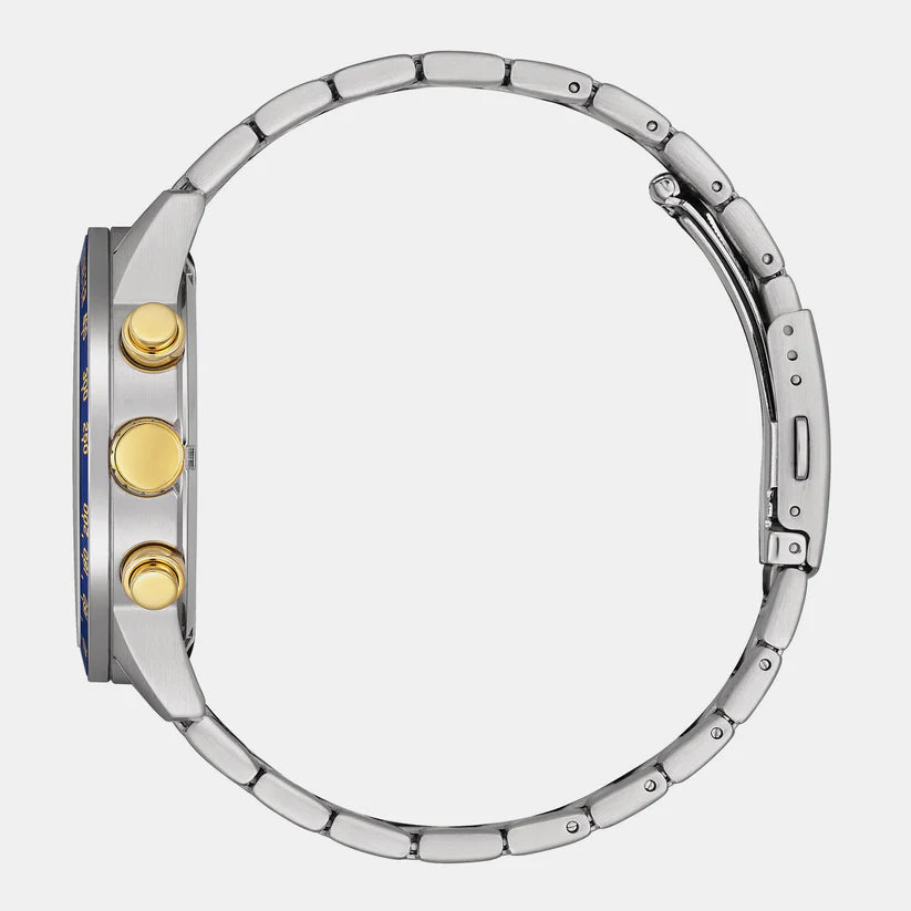 Crafted in Japan, this Citizen watch offers a blend of functionality and style. The 44mm round stainless steel case houses an exquisite grey dial with an analog display. The 23mm silver strap is made from sturdy stainless steel, fastened by a foldover clasp with a push button. This Quartz movement watch is weight perfect at 148 gm. It's 12mm in case thickness and can resist water up to 10 ATM, making it perfect for daily casual wear. Rest assured with a 2-year warranty.