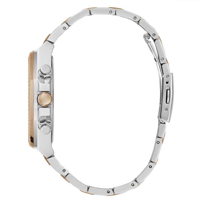 With a touch of class and the added feature of functionality with this silver and rose gold Guess Equity Black Link GW0703G4 watch. Constructed with recycled steel, this gent’s watch features a quartz analogue movement for precise timekeeping. Designed with a brushed and polished finish, textured bezel for a touch of uniqueness it is an eye-catching piece. The black sunray dial pairs perfectly with the silver and rose gold tones throughout complimenting each other seamlessly, with 50 meters water resistance this watch is the perfect for daily wear.