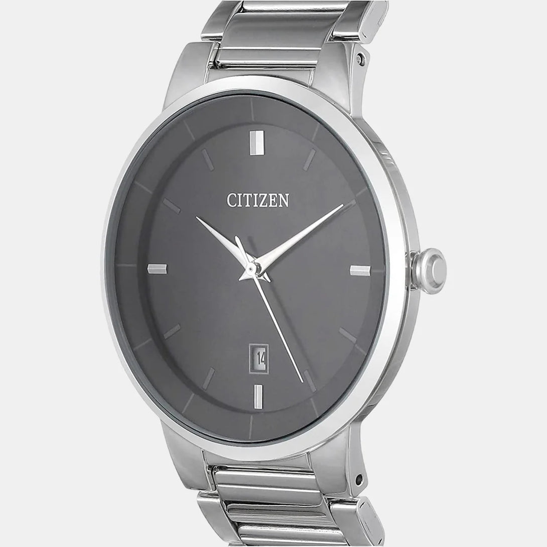 Mens Quartz model with date of month feature, stainless steel case, mineral glass crystal, stainless steel crown, stainless steel snap on caseback (room for engraving), stainless steel bracelet with push button fold over claps, black tone dial, silver tone hour, minute, and second hands (no luminous), silver tone applied hour indices (sticks at 12, 3, 6, and 9, no luminous) Since its foundation in 1930, CITIZEN has promoted a multi-cultural mindset that fosters excellence and creativity. The very name of the brand conveys a deep respect toward craftsmanship and considered as familiar by citizens the world-over. So as a citizen of the world, we bear the responsibility to help cultivate a culture of positive change and on-going evolution through our craft. We take that mission seriously and steadfastly welcome what the future may bring. As a true manufacture dhorlogerie, CITIZEN integrates a comprehensive manufacturing process from creating individual components to a watchs final assembly. Its an artisans approach to watch making based on pushing forward the boundaries of technology and leveraging our experience toward exploring new possibilities. One pivotal technological breakthrough was the development of a light-driven watch. CITIZEN pioneered this engineering innovation well ahead of other watch manufacturers as early as 1976, which led to the launch of the highly acclaimed Eco-Drive in 1995. Utilizing electrical power converted from virtually any light source, this extraordinary innovation changed forever the way watches could be powered. Eco-Drive eliminated the need to ever replace batteries, which made it especially beneficial to areas where such specialist batteries were not obtainable. This leveled the field for citizens of virtually every country to be able to experience unrestricted joy of wearing and using a CITIZEN watch. The product development policy, The Fusion of Technology and Beauty, remains a constant motivation for us to merge cutting-edge technology with perfection of design beauty, which as a consequence inspires people to strive to be their best at any time. CITIZEN launches a new campaign in collaboration with Wieden+Kennedy, Better Starts Now. This is the simple belief that no matter who you are or what you do, it is always possible to make something better and now is the time to start doing it. We believe that better and now are both infinite, and that there is always a next better and a new now in which you can start pursuing it. It was clear from the onset of this project that we are dedicated to this ideal not to the past but to the present, and all the way we can improve it. To help communicate this belief to the world we have created a new global CITIZEN brand movie, brand identity and brand website that represents out Better Starts Now philosophy. Citizen quartz men's silver tone stainless steel 3 hand basic with black dial.