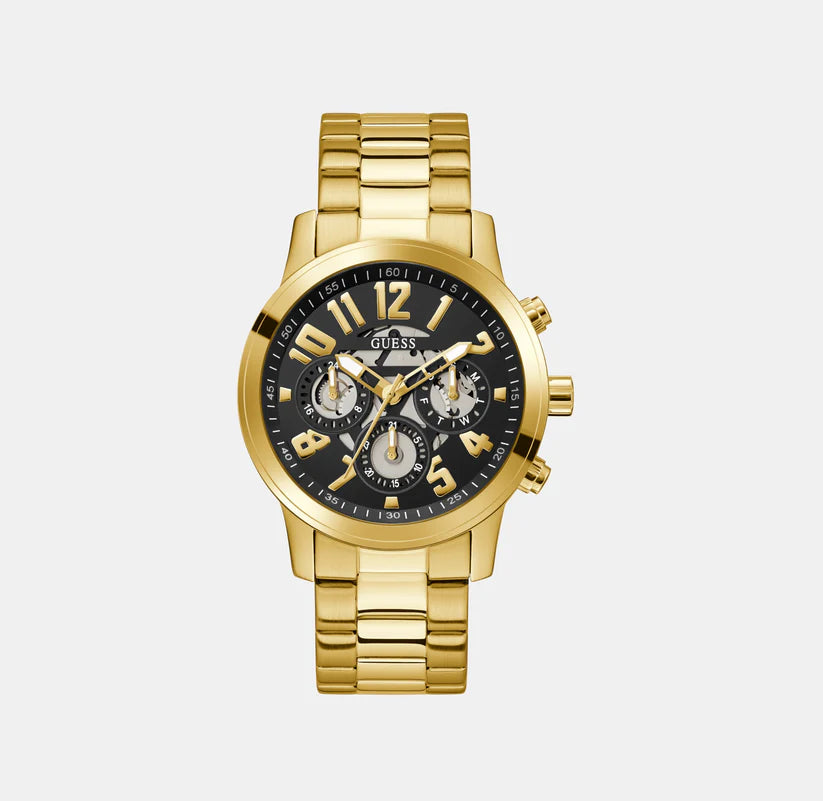 Make a bold statement with the GW0627G2 Men's Analog Watch. This round 44mm watch features a black dial and a stainless steel case with a gold strap. It operates on quartz movement and offers 5 ATM water resistance. The pilot buckle clasp adds to its style, making it perfect for casual occasions. This watch weighs 150 grams and includes a 2-year warranty. Crafted in the USA.