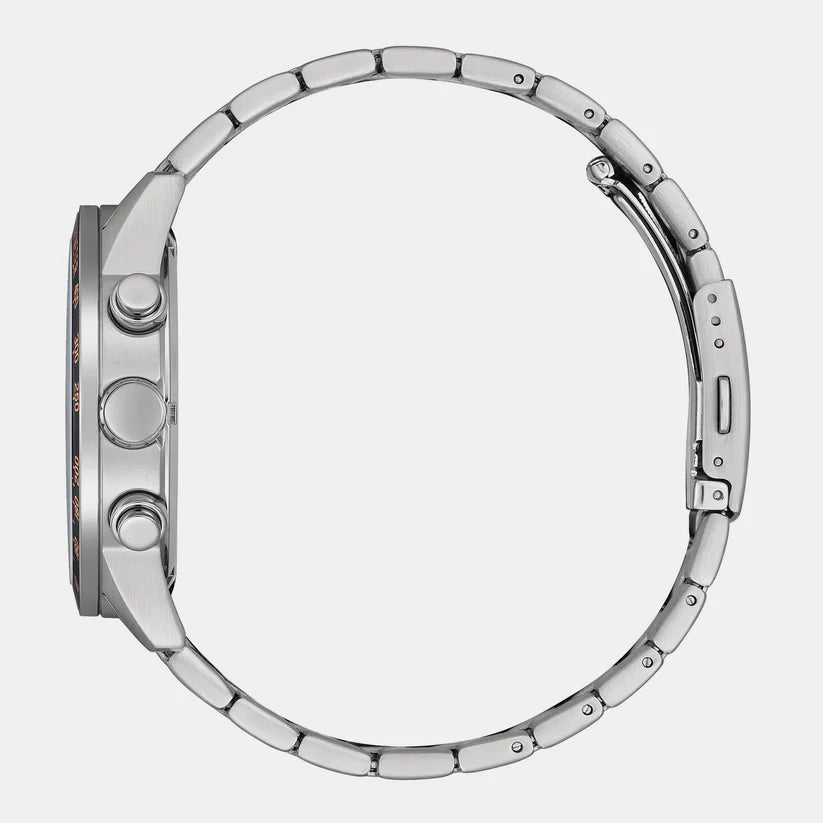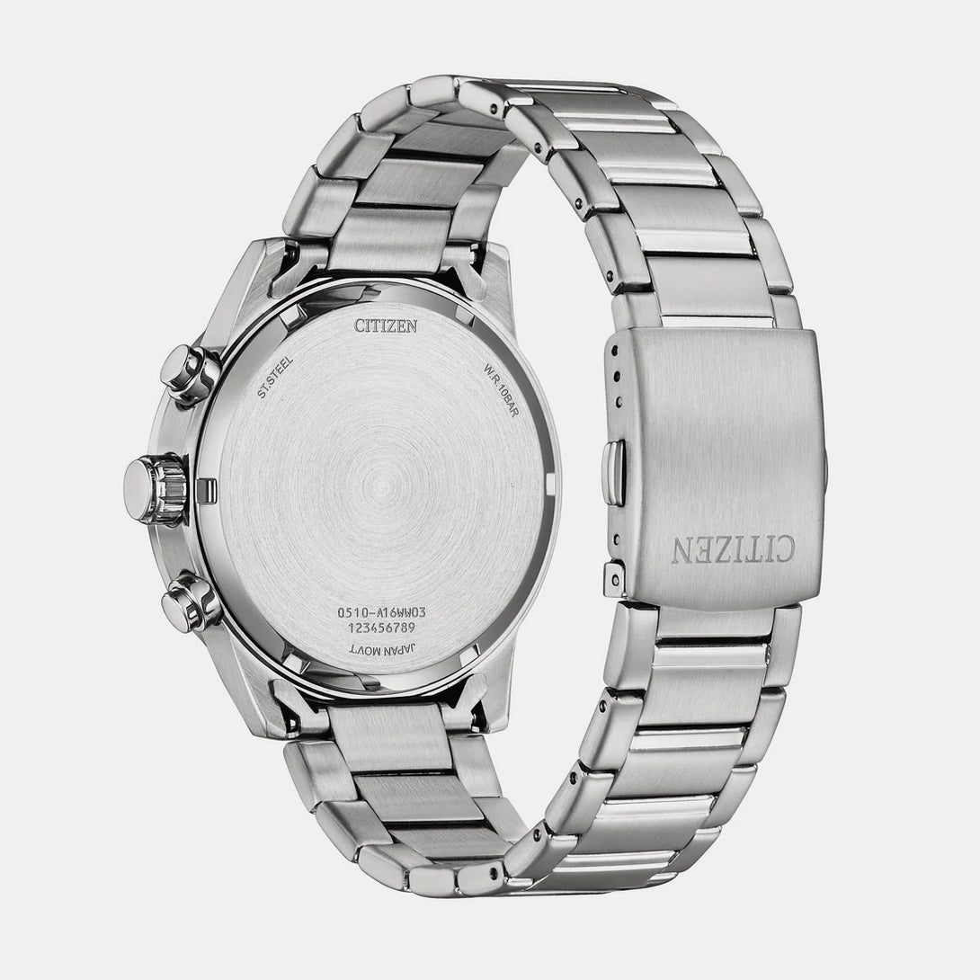 Crafted in Japan, the Citizen Men's Watch showcases a Round Stainless Steel case, a Black Analog dial, and a durable Silver strap. It is a casual watch that's water-resistant and backed by a two-year warranty.