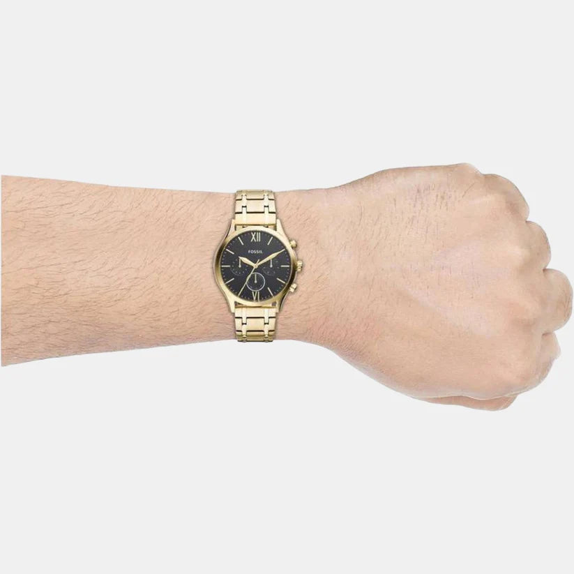 Look modish by donning this men analog watch from Fossil. Enclosed in a case, the grey round dial is secured by a mineral glass. It displays chronograph, and a crown for time adjustment. The strap showcases a gold hue that uplifts the look of the timepiece. Besides, it is finished with a fold-over clasp with double push button safety clasp that provides a secure fit on the wrist.