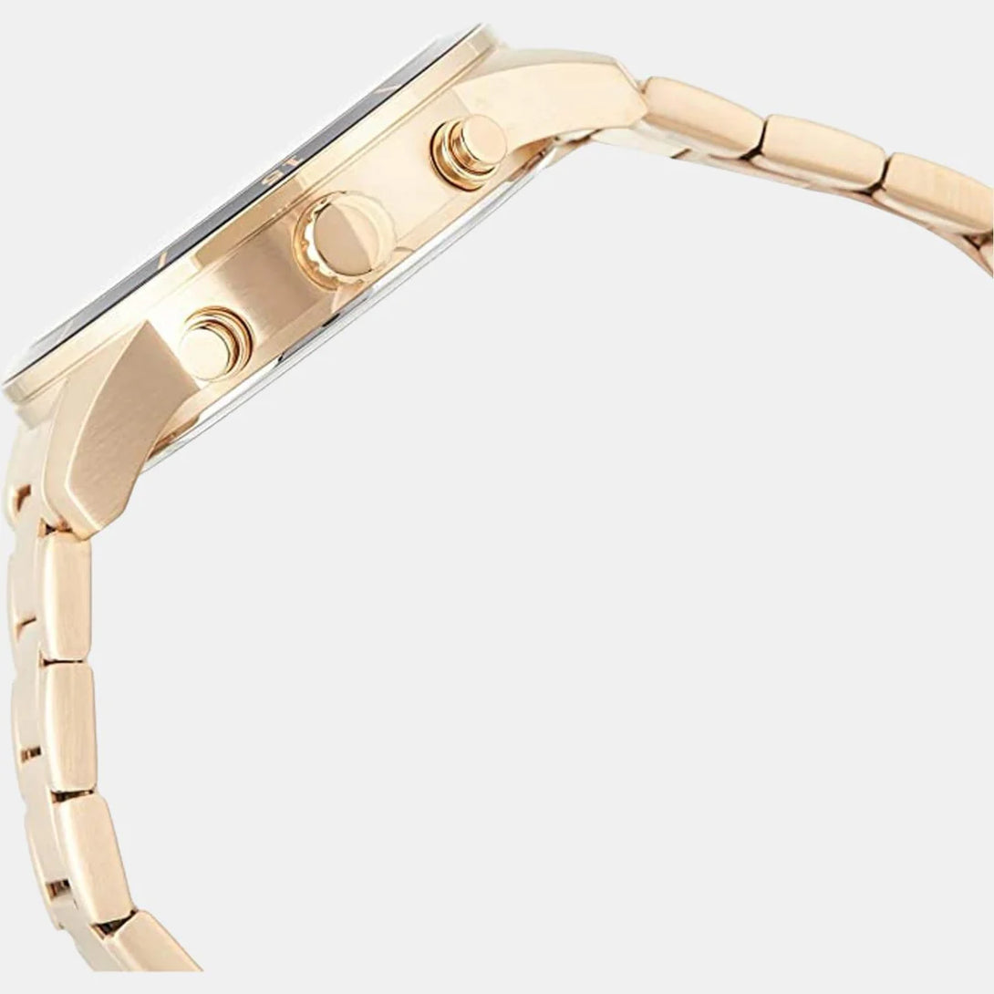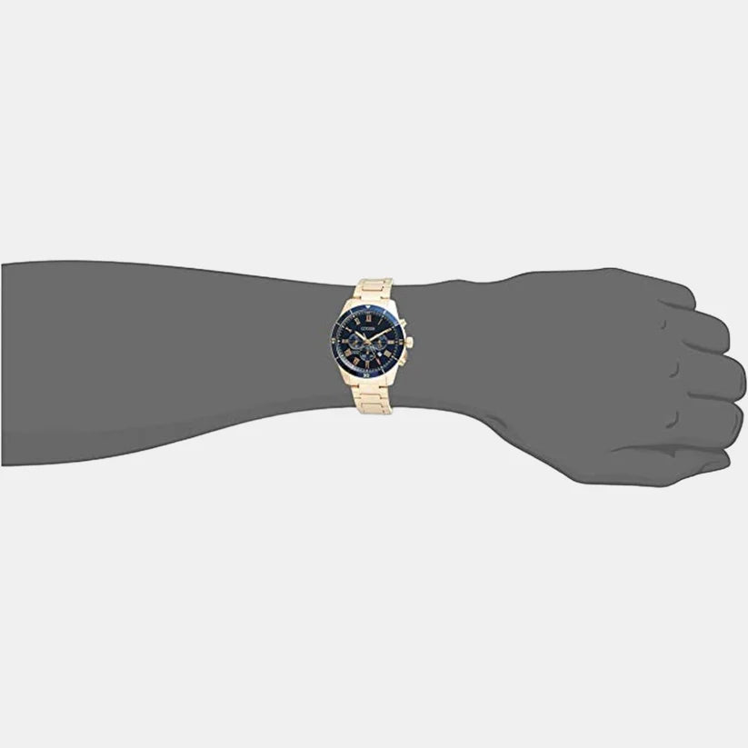Blue dial enhanced by luminous rose gold-tone hands. Rose Gold-tone stainless steel case with a rose gold-tone stainless steel band. Quartz movement. 50 meters / 165 feet water resistance. Fixed bezel. Scratch Resistant Mineral crystal. Solid caseback. Fold Over with Push Button Release clasp. Case size 44 mm x 12 mm. Band 22 mm x long. Citizen AN8169-58L Watch.