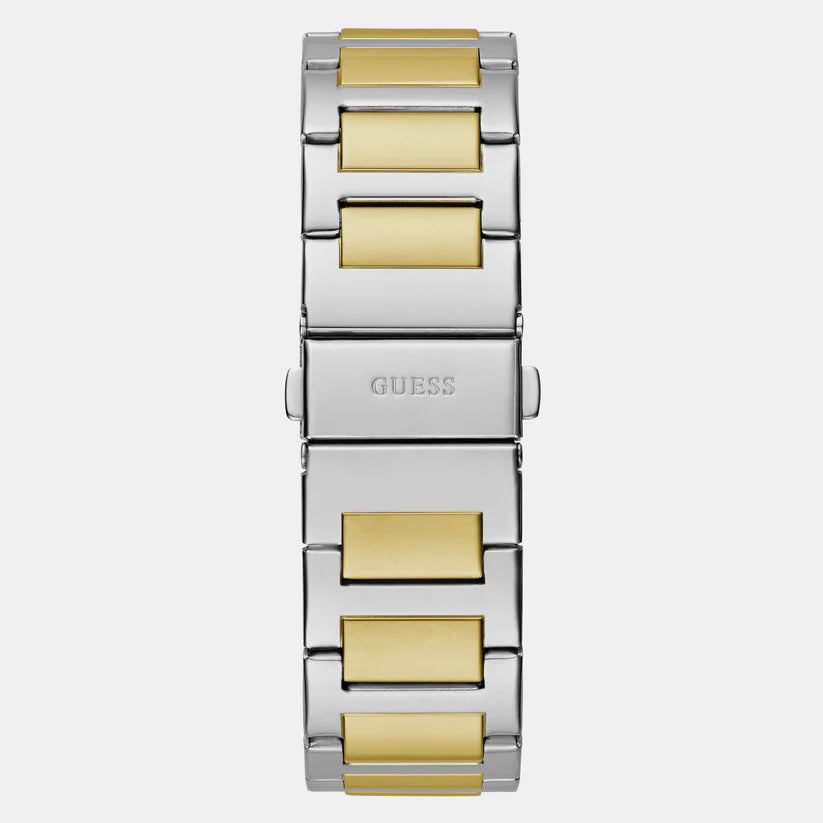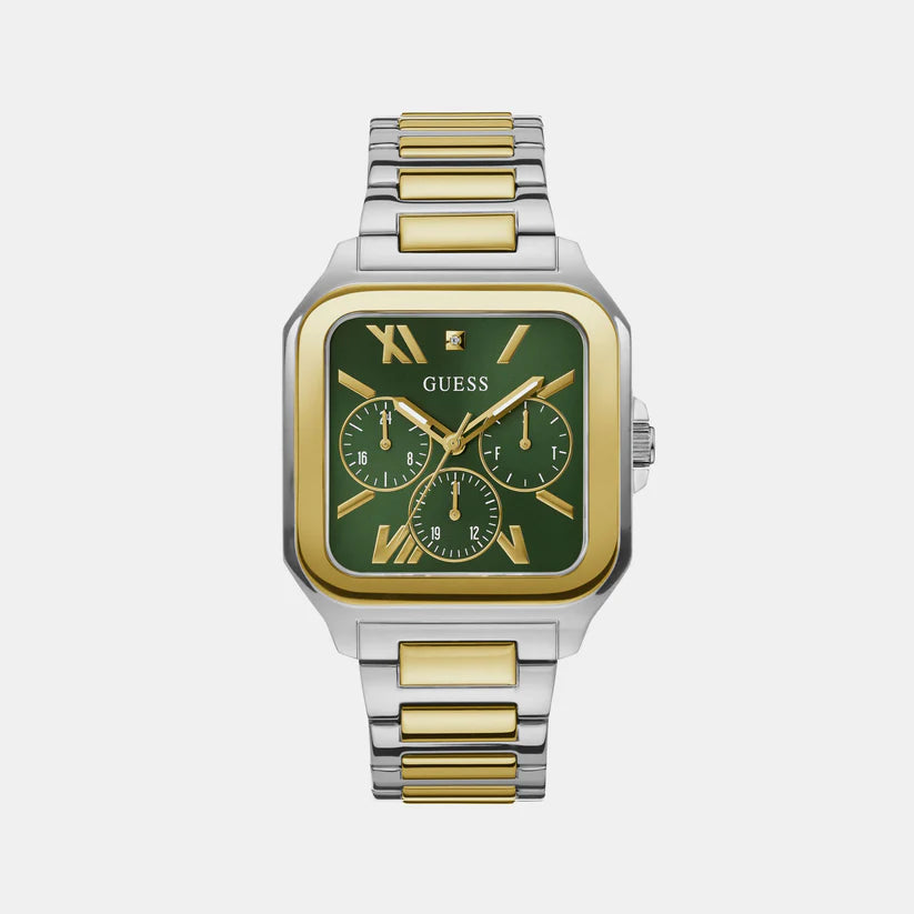Flaunt your style with this male chronograph wristwatch. The square 42 mm case and green dial, made of stainless steel, provide a distinctive look. The stainless steel strap, 22 mm wide, features a two-tone design and a pilot buckle. With chronograph display and quartz movement, this watch is water-resistant up to 1 ATM. Ideal for casual wear, it weighs 140 gm, has an 11 mm case thickness, and comes with a 2-year warranty. Proudly made in the USA.