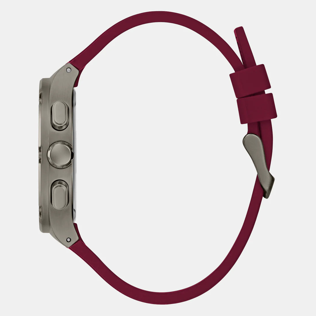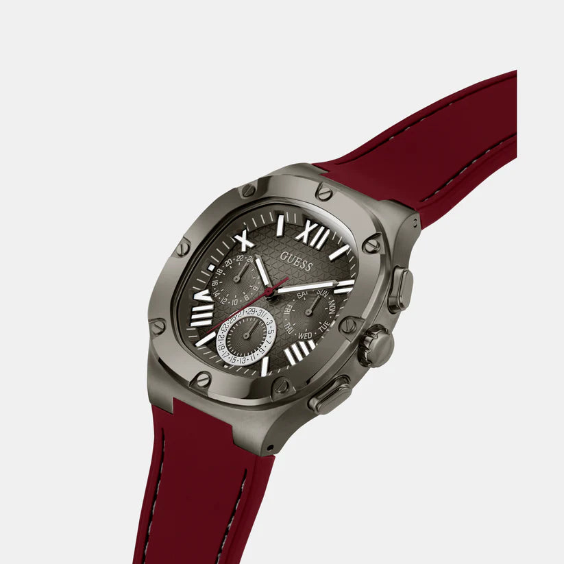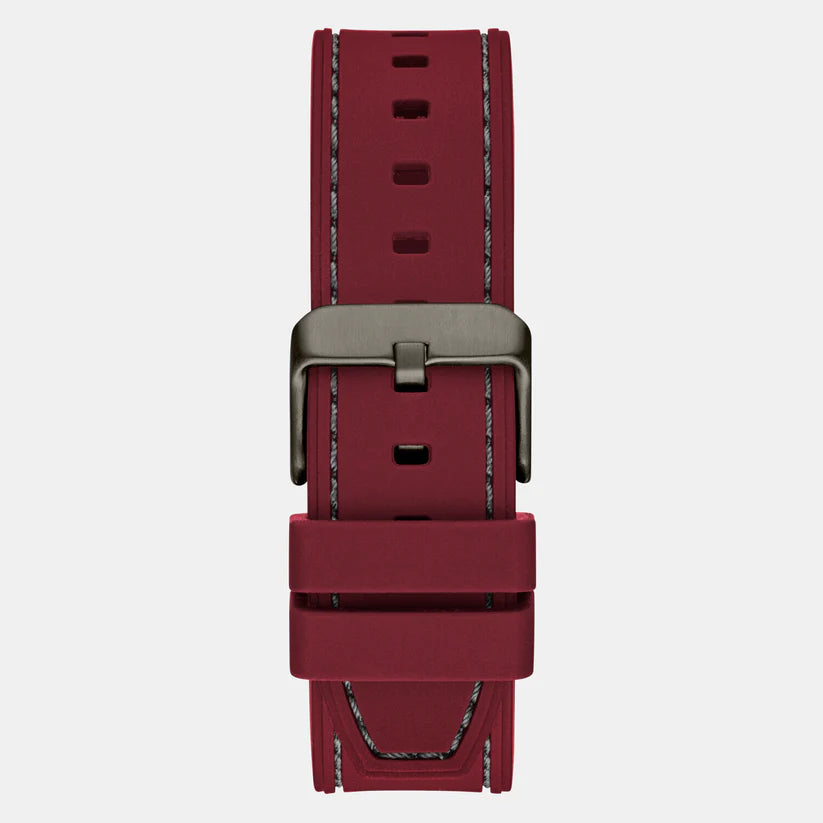 Elevate your style with the GW0571G4 Men's Analog Watch. This square-shaped timepiece features a 42mm stainless steel case with a sleek grey dial. The watch is powered by precise quartz movement and comes with a comfortable silicone strap in red. With 5 ATM water resistance and a strap buckle clasp, it's designed for casual occasions. This watch is crafted in the USA and includes a 2-year warranty.