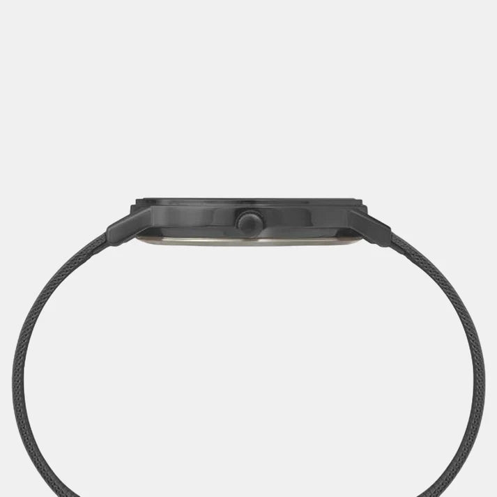 This is a men's analog quartz watch with a round brass case that measures 41mm in diameter and is colored grey. The watch is water-resistant up to 30 ATM and has a mineral glass for protection. It features a black stainless steel band that is 20mm wide and is secured with a push-button deployment clasp.