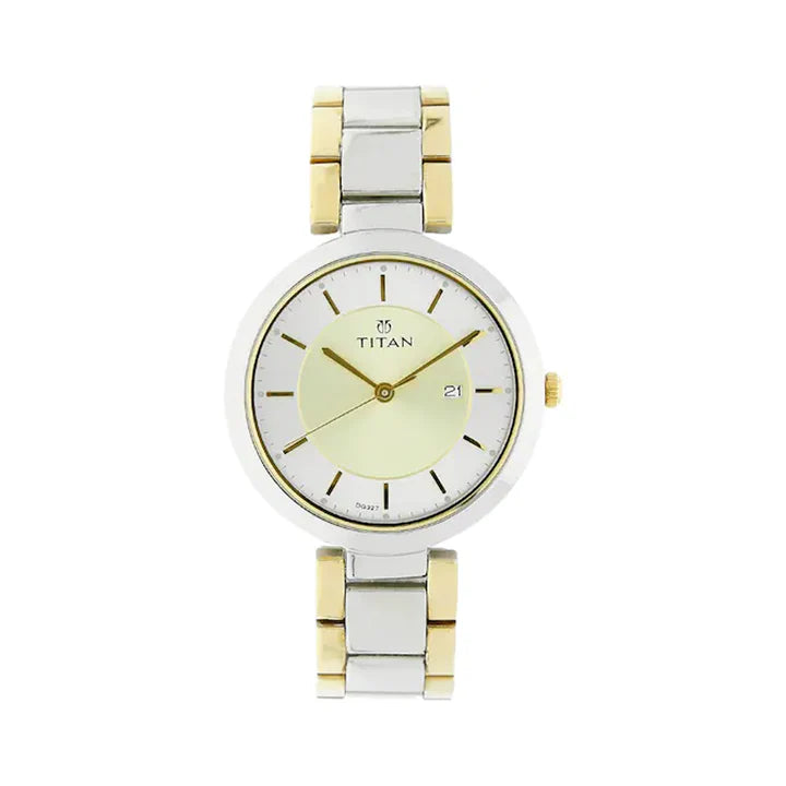 Exuding modern day styling, this women's analog watch from Titan is specially made to exhibit feminine grace. It comes with a two-tone golden round dial which along with twelve gold-plated indices lend it a refined look. The ion-plated bimetal stainless steel golden and silver bracelet elevate its look. It can be paired with a dress while you go out with your friends for a casual brunch.